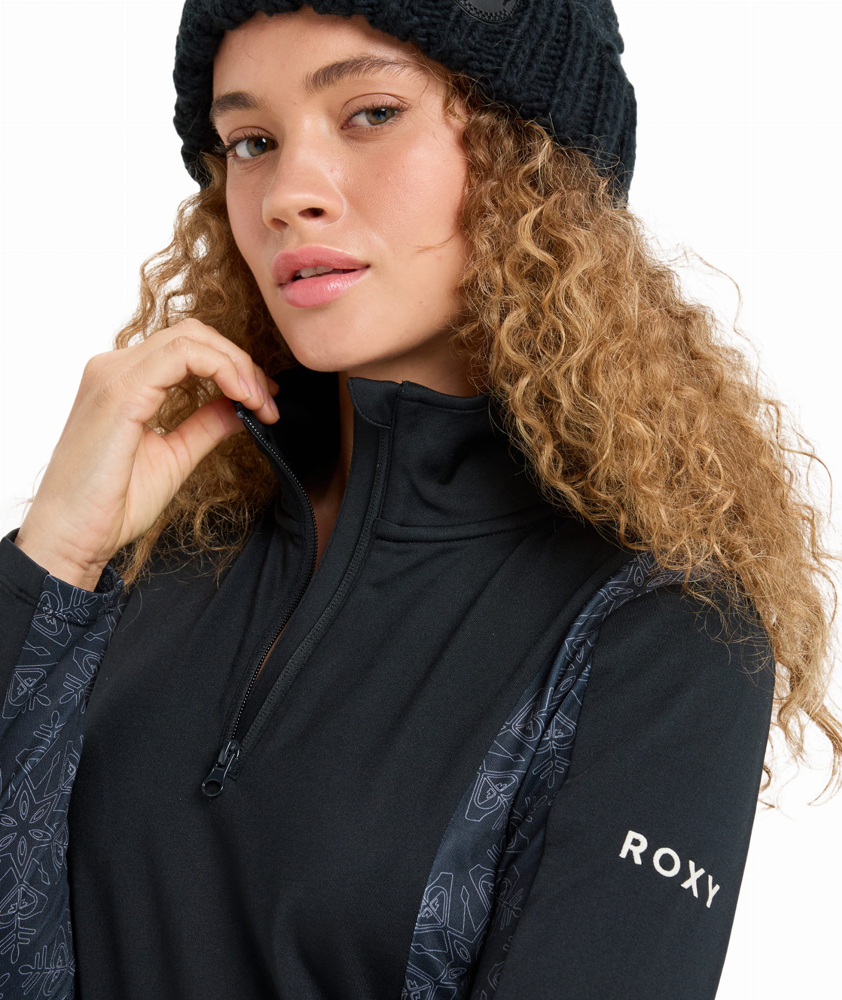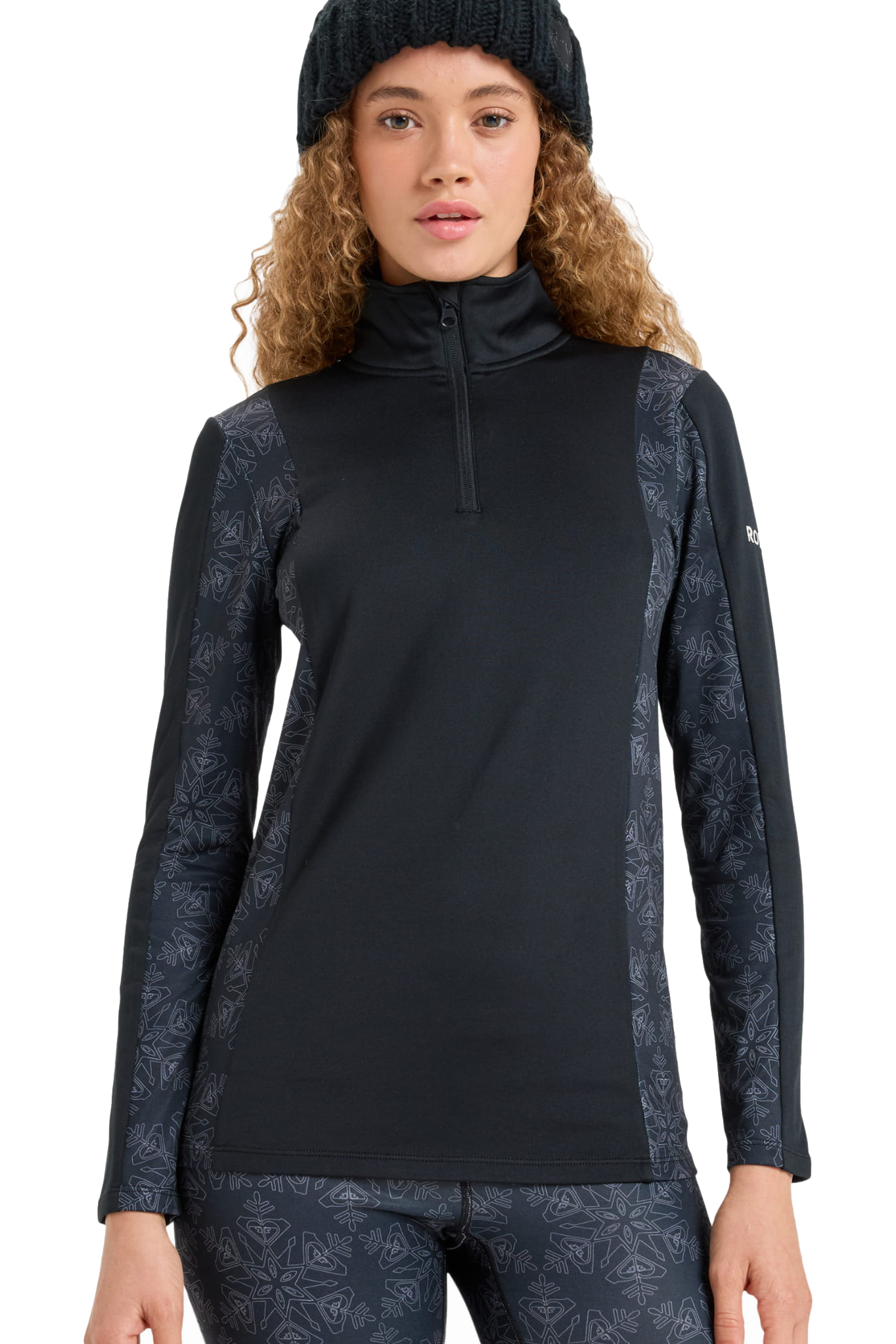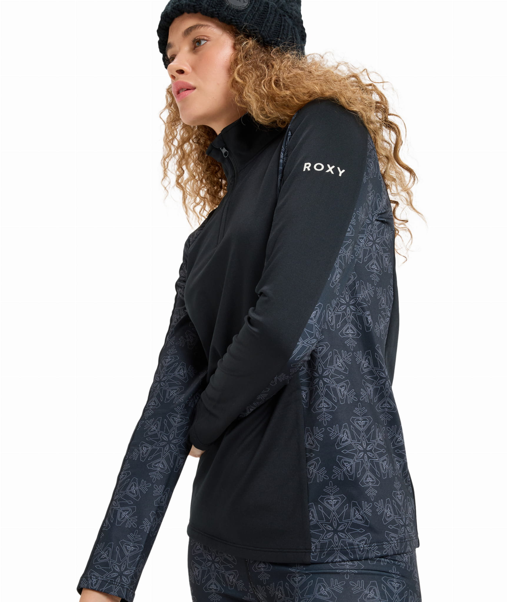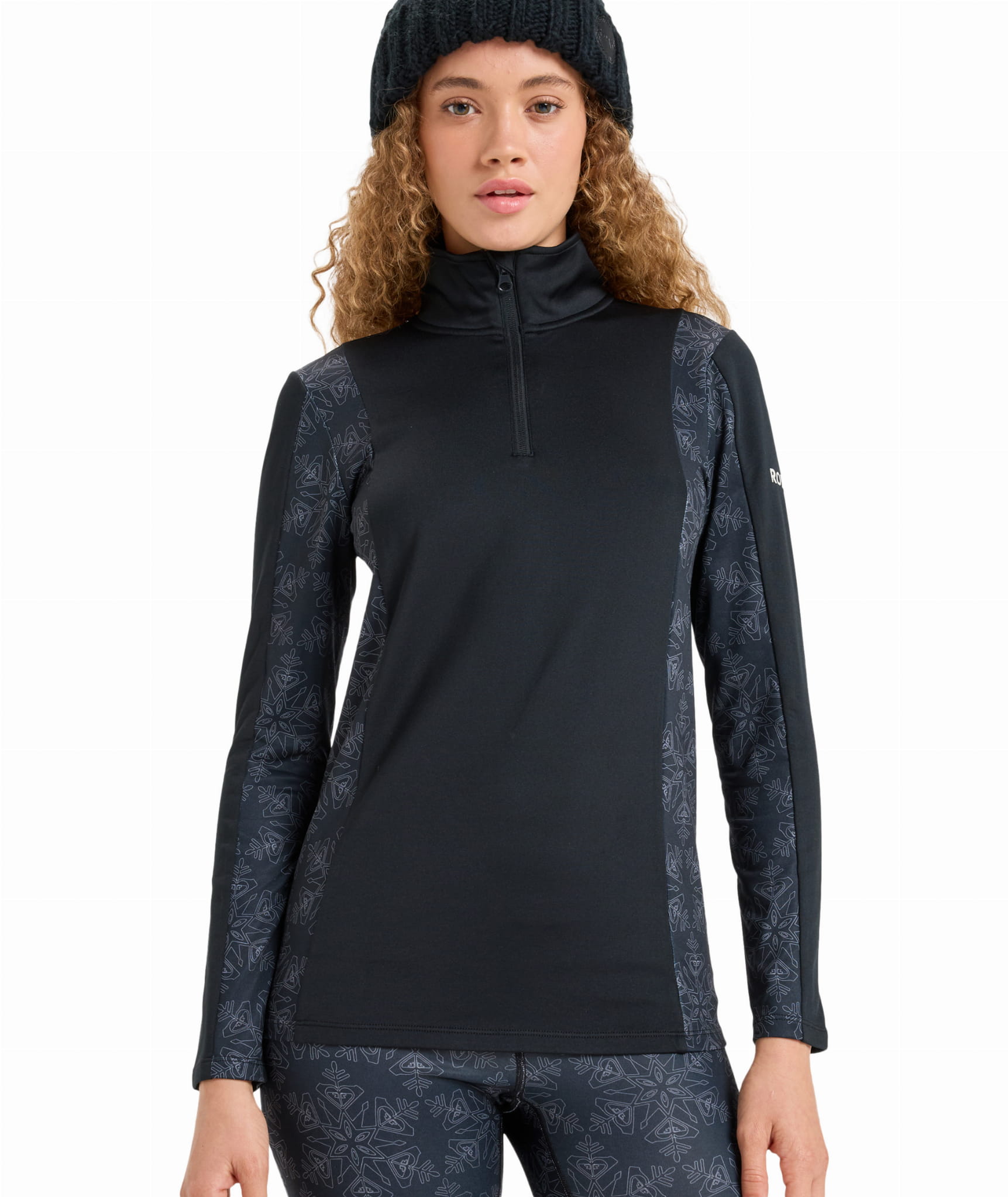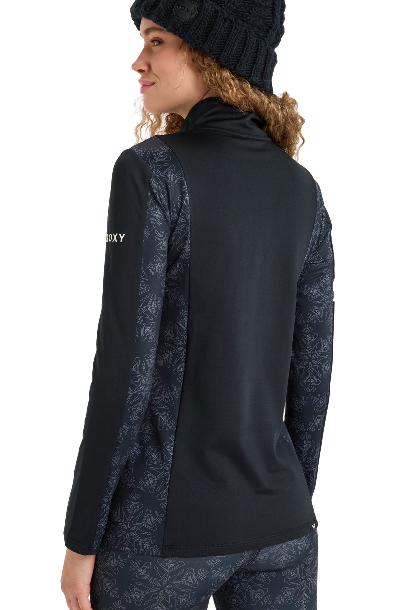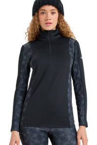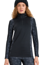 Elastyczne, płaskie szwy minimalizują ryzyko otarć pod kurtką czy plecakiem, a krótki zamek pod szyją ułatwia regulację temperatury. Subtelny wzór w płatki śniegu na panelach bocznych nadaje całości sportowego, ale kobiecego charakteru.