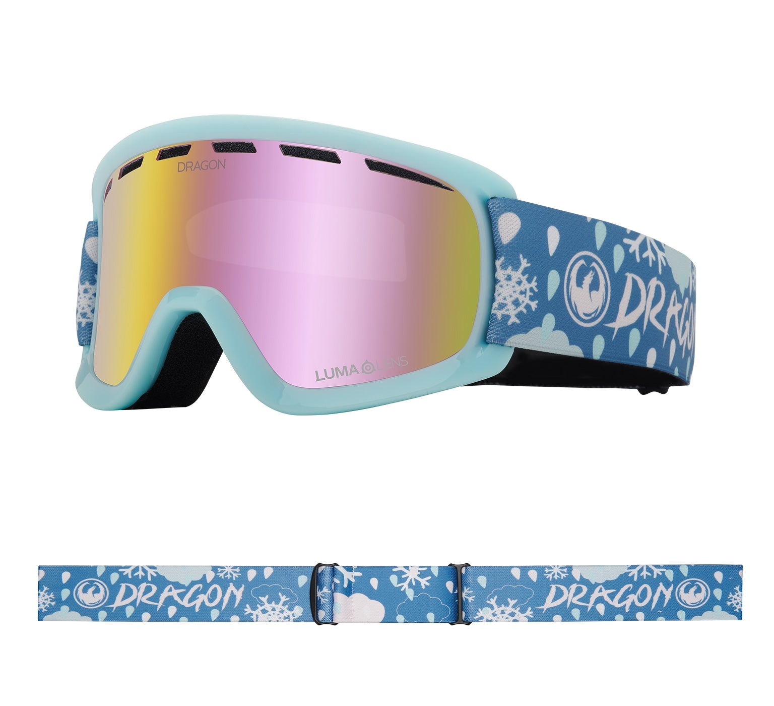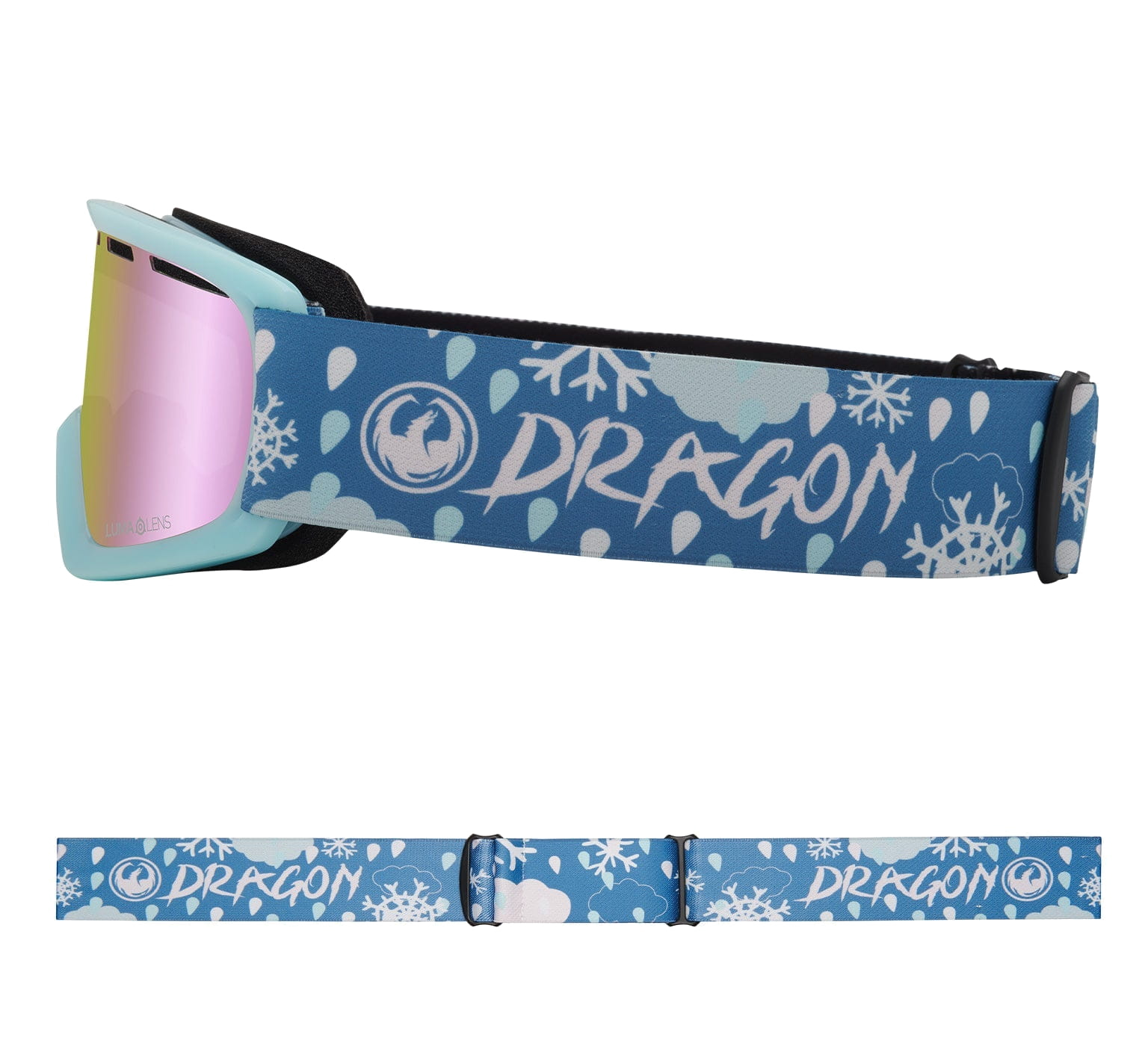 Elastyczny pasek w kolorze Snowdance z motywem śnieżynek i logo Dragon wyróżnia się na stoku i świetnie komponuje się z dziecięcą odzieżą narciarską. Różowo-złota szyba Pink Ion dodaje goglom nowoczesnego, „dorosłego” looku, który mali riderzy bardzo cenią.