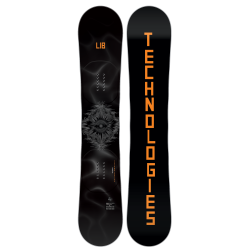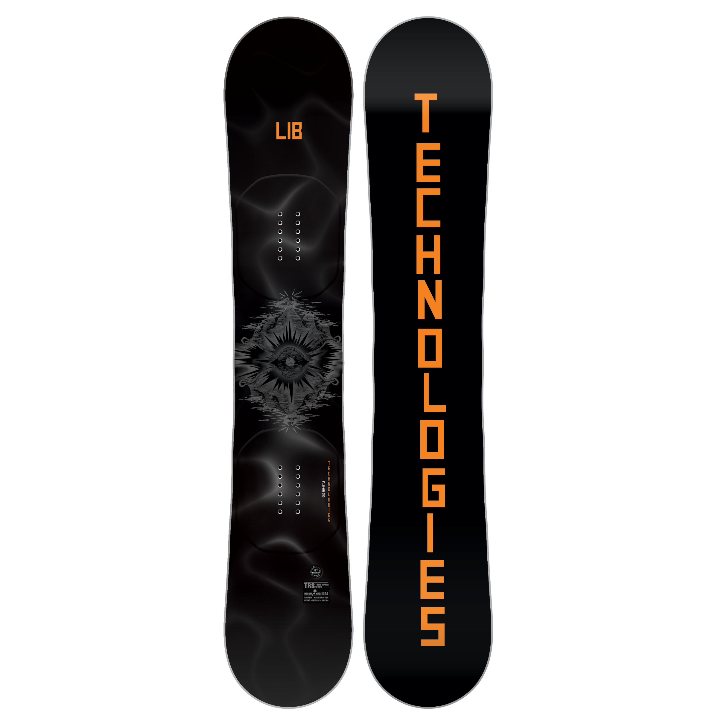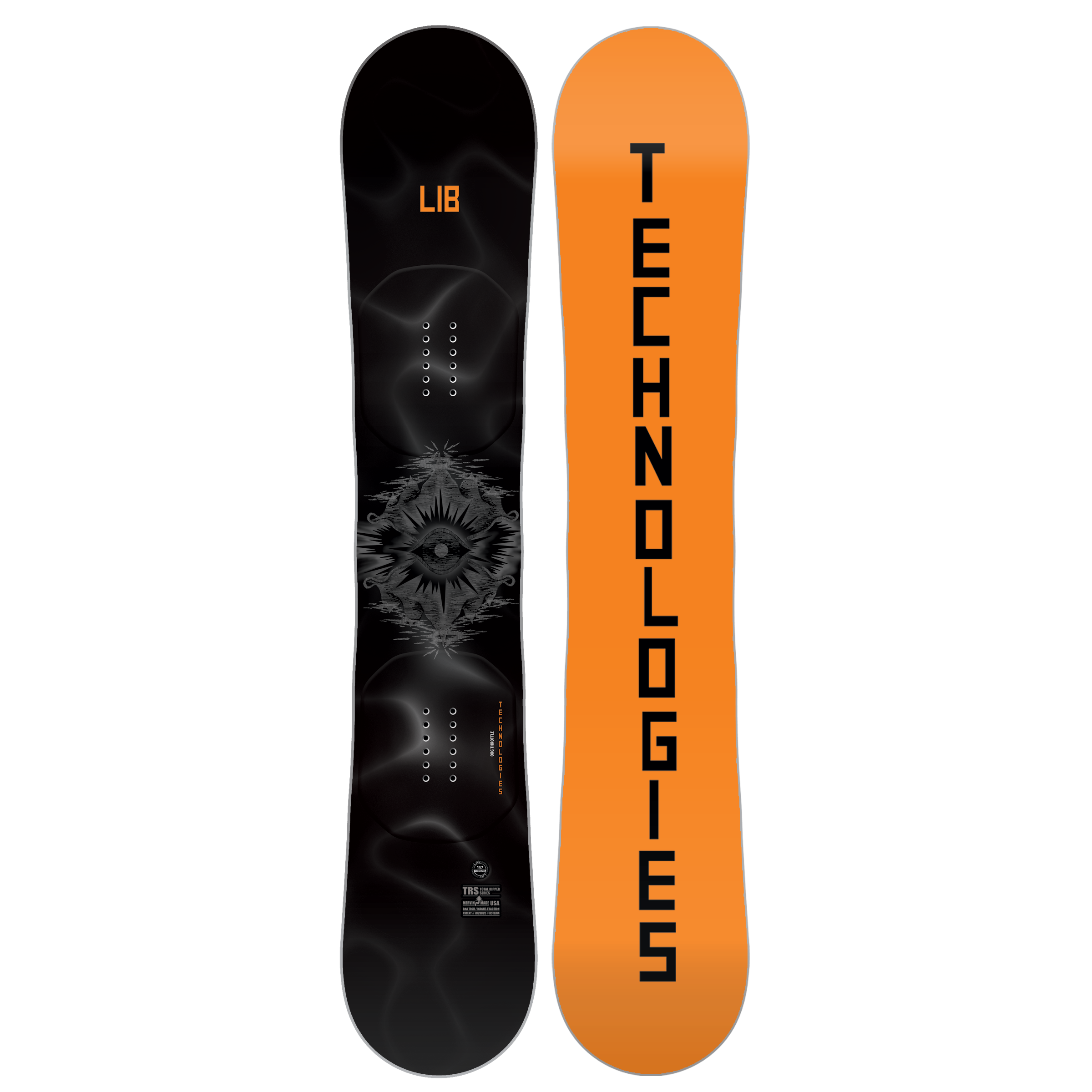 Czarny, minimalistyczny top z hipnotyzującą grafiką w centralnej części oraz kontrastującym logotypem LIB pod wiązaniami nadaje desce techniczny, nowoczesny charakter. Spód z dużym napisem TECHNOLOGIES w intensywnym, pomarańczowym kolorze (w zależności od wersji na czarnym lub pomarańczowym tle) świetnie wyróżnia się na śniegu i podkreśla wyczynowy rodowód serii TRS.
